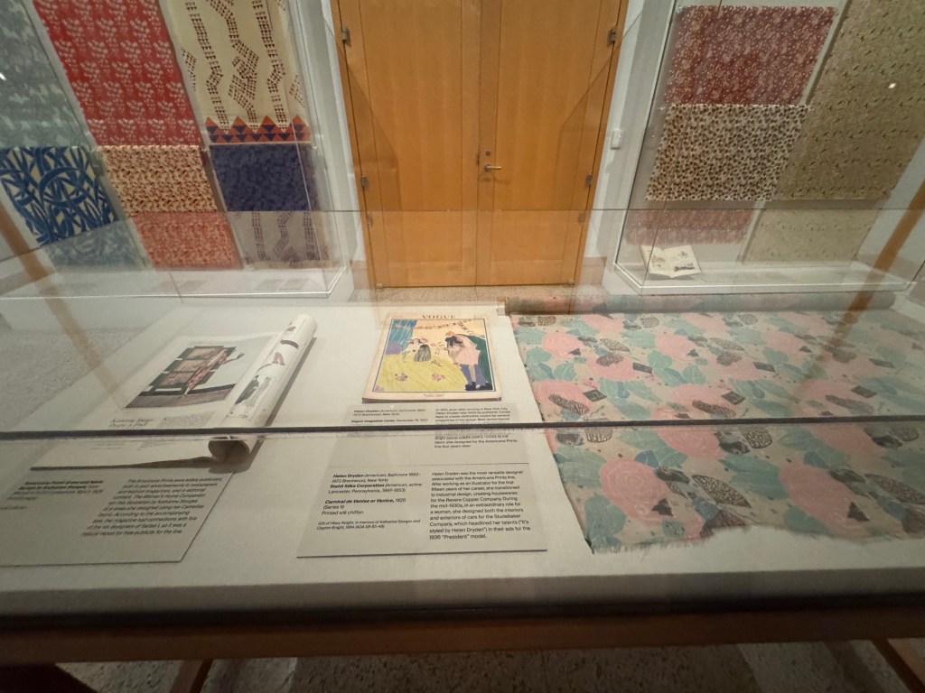 French fashion design shaped American fashion design from the late nineteenth century Art Nouveau era until Art Deco, in the early 1920s and 1930s. The focus on Americana culture in fashion contrasting the strong French influence on fashion of the time is prominent here in this exhibition. Throughout, there is a focus on particularly Americana fabrics and prints, holding extreme contradictions to the focus on french fashion and style at the time.