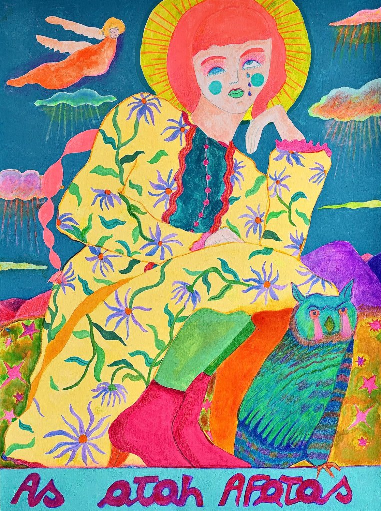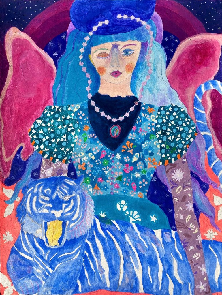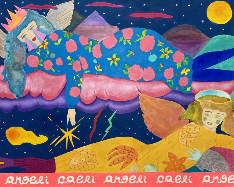 “Visualizing the celestial world of the divine feminine and ethereal, Mazza pictures herself through choices of colors, patterns, and calculated compositions of spiritual deities. Robed in garments inspired by fashion designer Anna Sui and contemporary fashion, these angels live life atop our world in the astral realm, depicting notions of a feminine, nurturing, Elysian God. Colors that are particularly foreign to earthly nature – such as bright neons, eccentric pinks, peacock blues – are used, emphasizing the divinity of godliness, loftiness, and the non-mundane glamor within femininity beyond the physical. Converting to Tibetan Buddhism, a contrast from her Catholic childhood, these airy depictions display a reclamation of a reborn spiritual being and identity through an esoteric, mystic, and feminine realm past this world.”