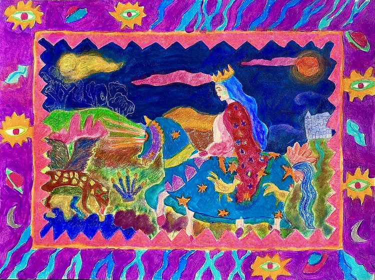 Mazza continues to explain how Yogananda teaches about Divine Mother, a figure playing a role akin to Mother Mary, the feminine part of God. Similarly, Divine Mother is the artistic feminine portrayal in Mazza’s work, whom she projects masterfully in her own imaginative astral realms. Divine Mother is parental; She is aware of our precarious state and what is or is not for our own good.