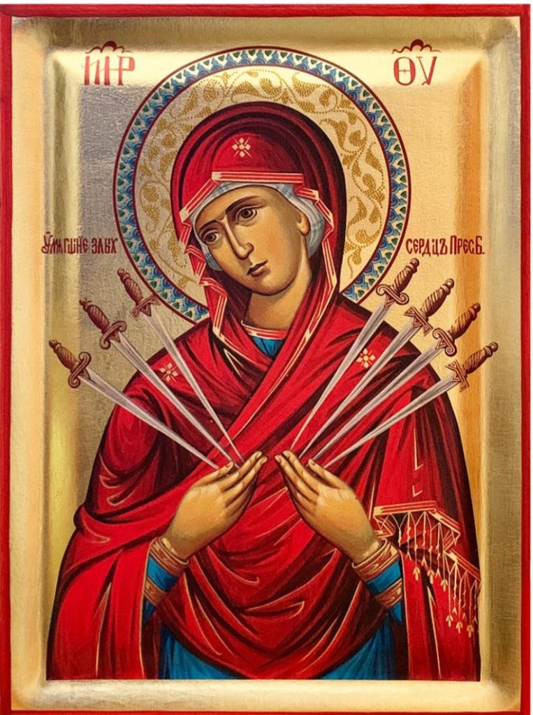 A comparison capturing this attitude comes to her mind: The humanity of Divine Mother and Saint Sebastien, both portrayed in Christian iconography as punctured by arrows. This particular half length icon is one of the few depictions of Most Holy Theotokos (Mother Mary) without the Christ Child. The stars above Her head symbolize Her innocence and divinity, and She is garbed in her classic attire of blue and red. Mazza reflects on the necessity of adversity, and how we all must to endure its subsequent pain in this realm. The lingering question concerning fairness behind physical “punishment” leaves us with varying answers constructed to sooth our nescience. One day, Mazza hopes, answers will come to light, filling gaps in our examinations of existence and meaning.